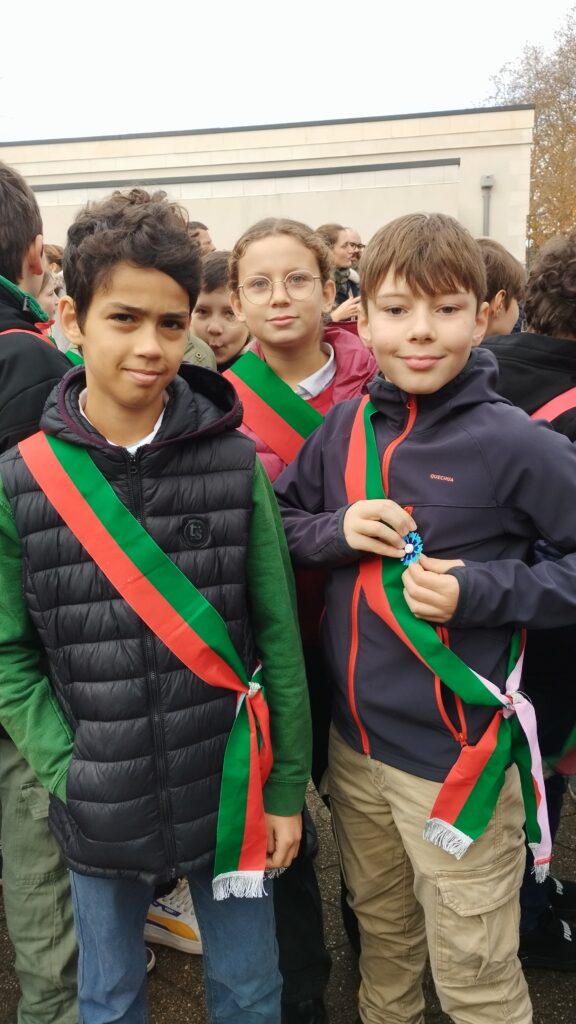 Moment historique pour notre école : pour la toute première fois, quatre élèves de CM2 ont pris part à la cérémonie municipale du 11 novembre, aux côtés des « officiels » ! Asma, Ismaël, Maxime et Jana font désormais partie du Conseil des Jeunes d’Olivet (CJO).